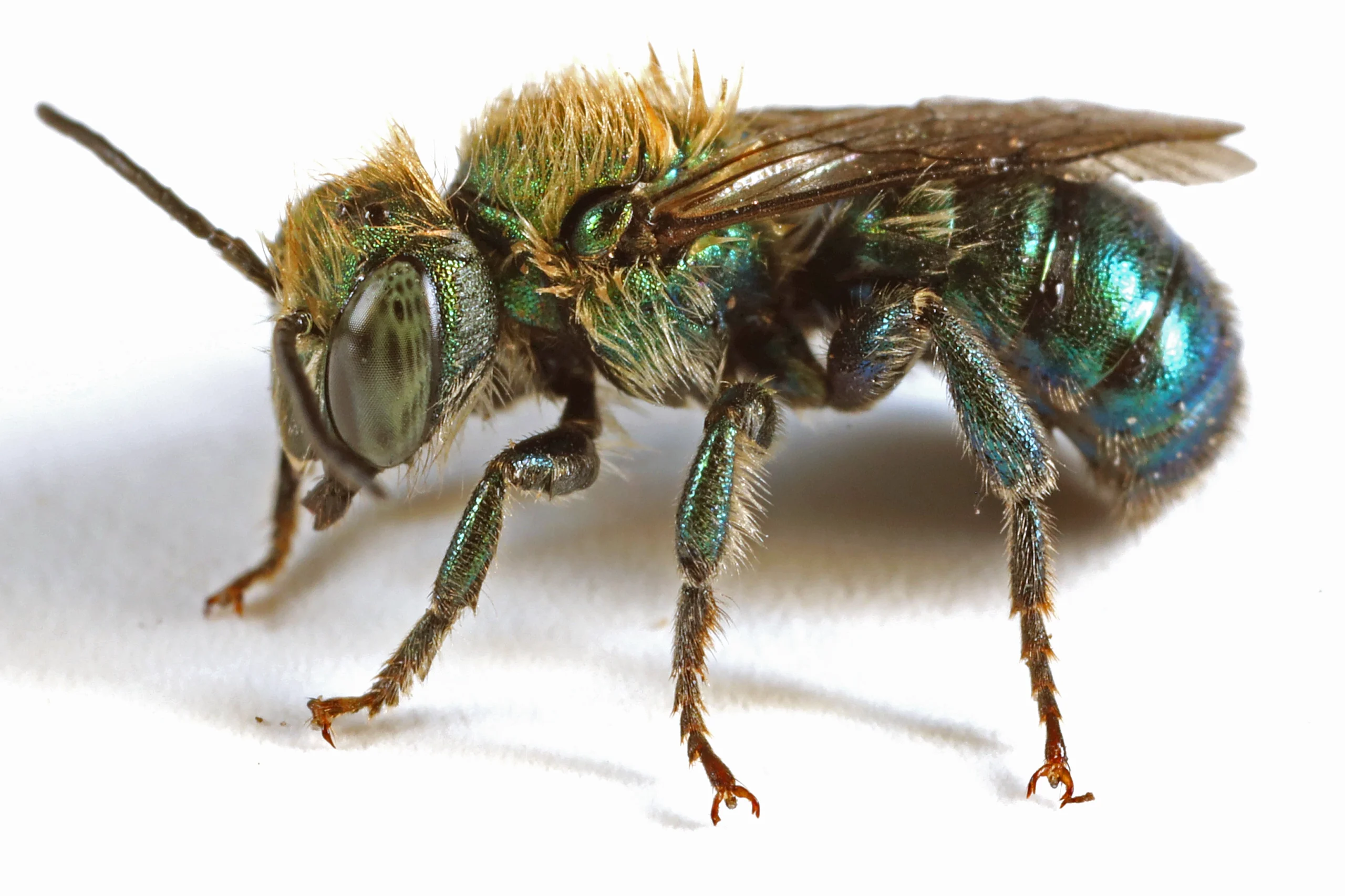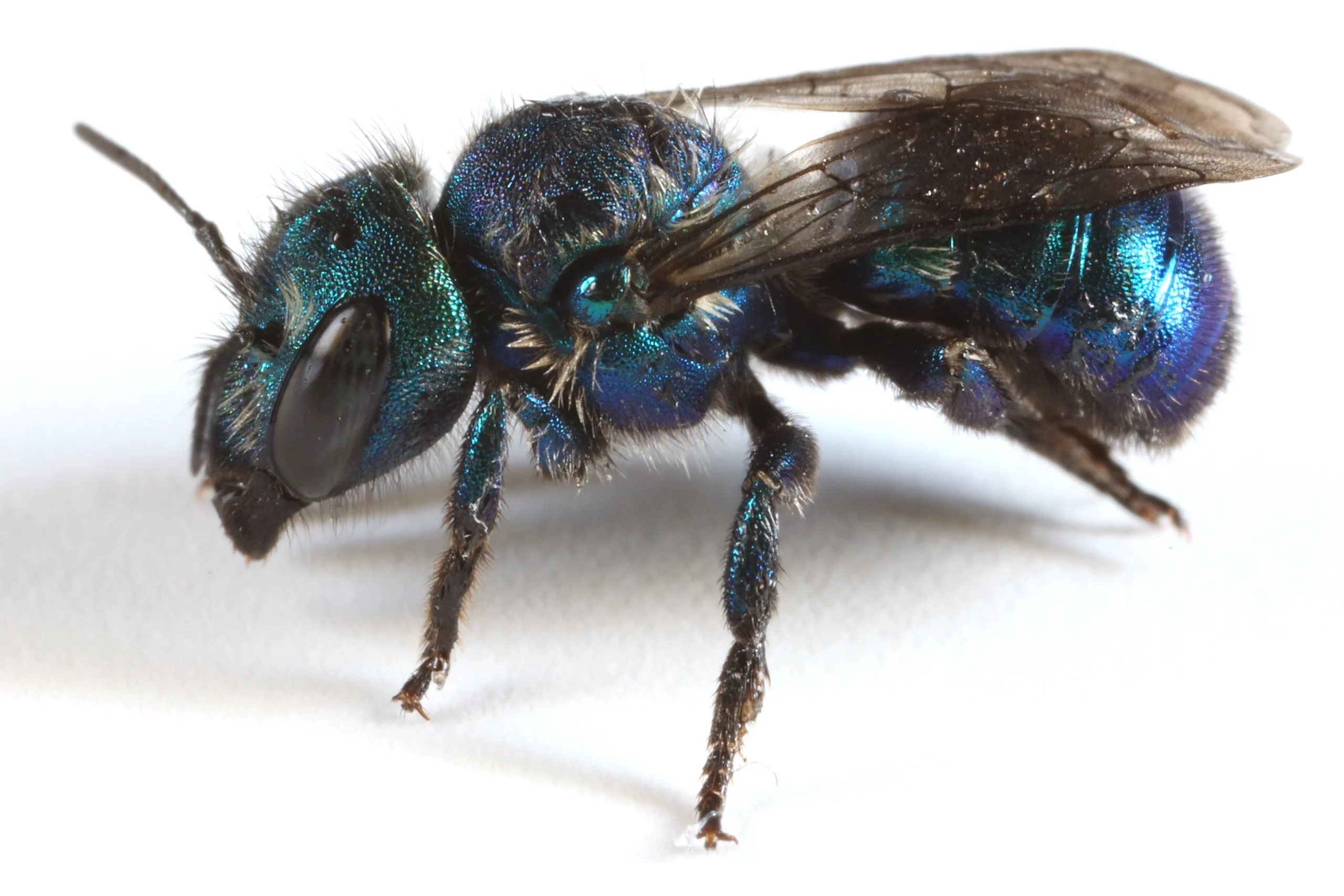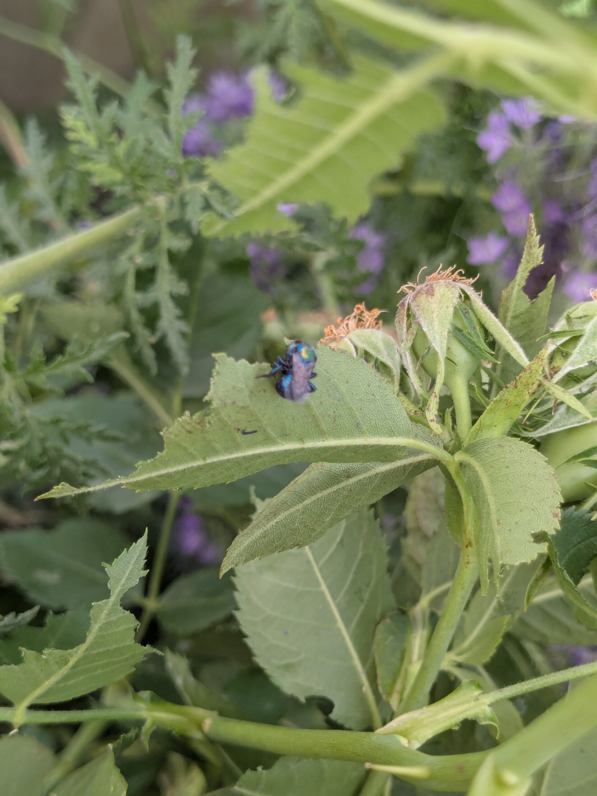 My name is Anna Goates. I am a student at Utah State University and I study bees at the USDA-ARS Pollinating Insects Research Unit. I’m studying the nesting of one species of bee, Osmia bruneri, a bee that’s native here in Utah and throughout the Great Basin area. Like many other bees, bruneri need more than flowers. Bruneri bees use leaf pieces to build their nests. A mama bee will bring lots of pollen to her nest using fuzzy hairs on her belly. Then she lays an egg on top of the pollen and builds a wall out of leaf pulp. Female bruneri are a shiny metallic blue, and male bees are a metallic lime green with a fuzzy white mustache on their faces. If you don’t look closely, you might think they are flies.